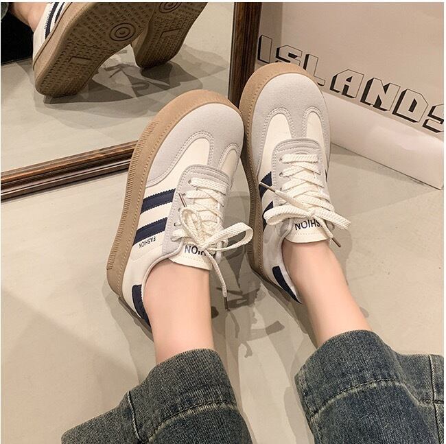 ・落ち着いた配色でスニーカーながらも足元をクラシカルな印象に。